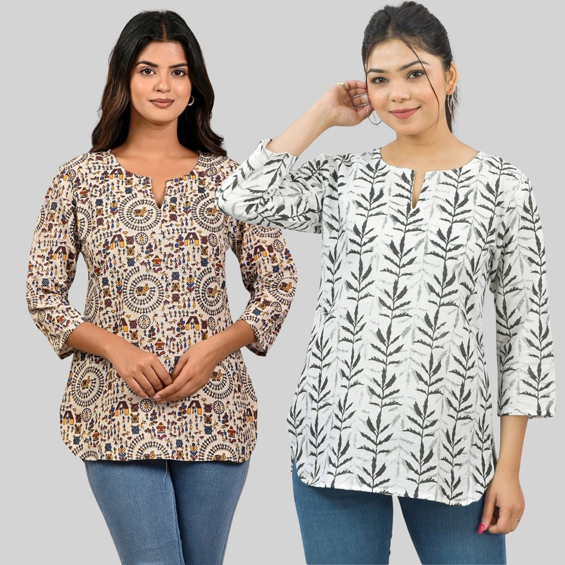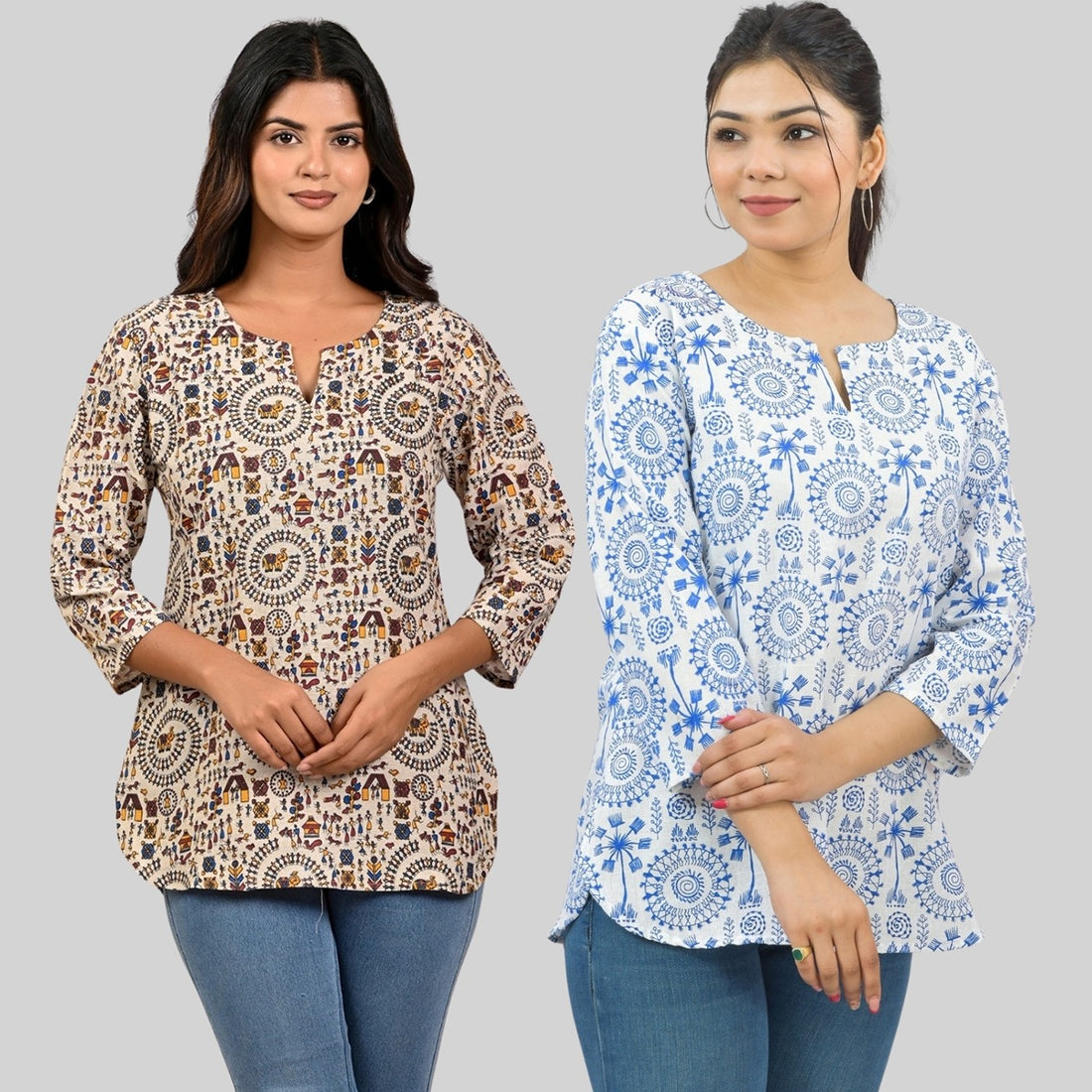 Pack Of 2 Womens Regular Fit Brown Multi Printed And Blue Tribal Printed Tops Combo