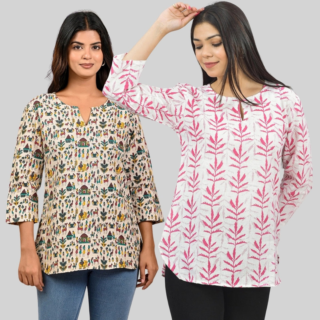Pack Of 2 Womens Regular Fit Pink Vactor And Blue Leaf Printed Tops Combo