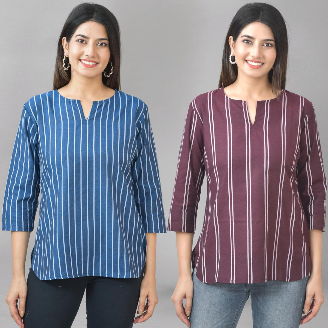 Pack Of 2 Maroon And Blue Striped Cotton Womens Top Combo