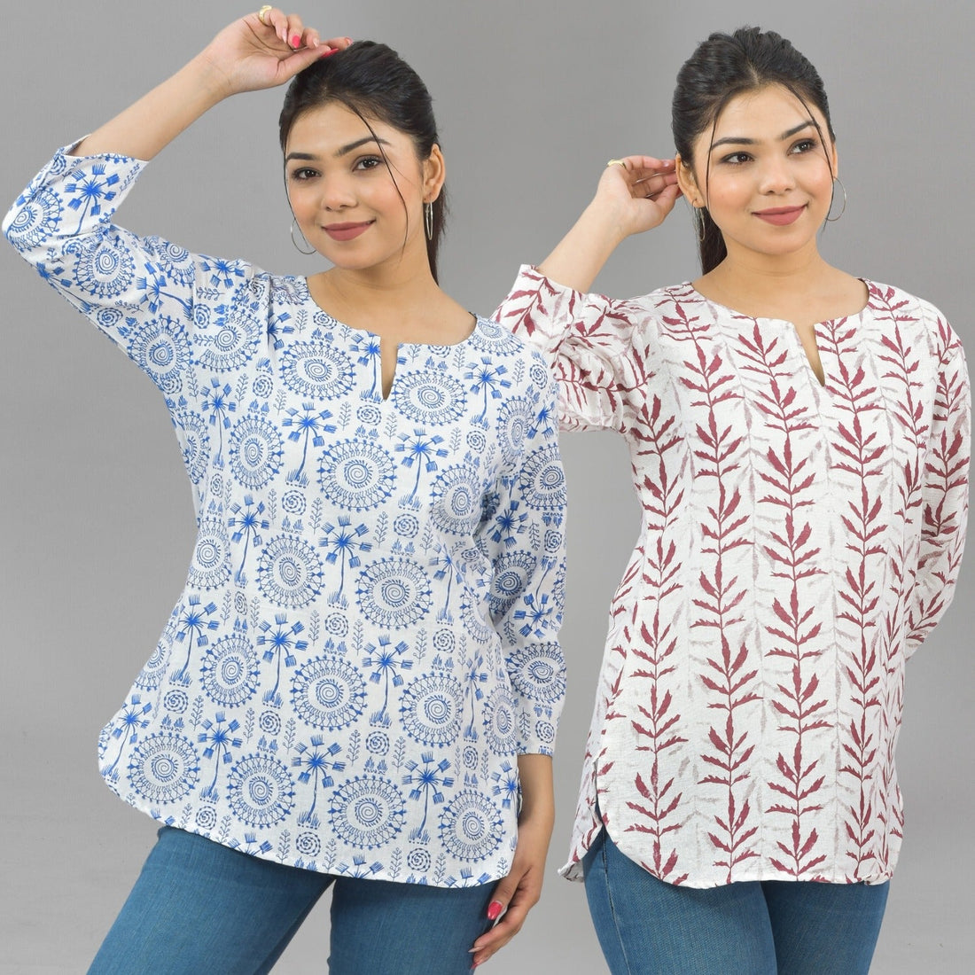 Pack Of 2 Womens Regular Fit Blue Tribal And Maroon Leaf Printed Tops Combo