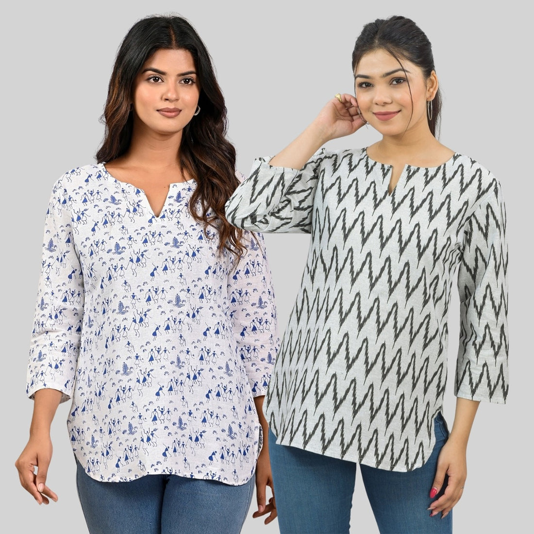 Pack Of 2 Womens Regular Fit Black Zig Zag And Blue Tribal Printed Tops Combo