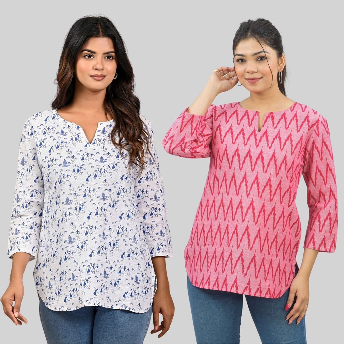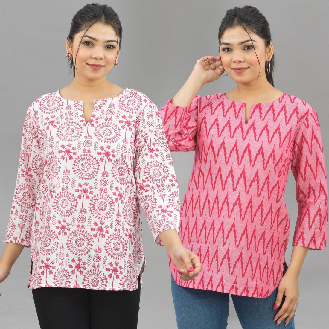 Pack Of 2 Womens Regular Fit Pink Tribal And Pink Zig Zag Printed Tops Combo