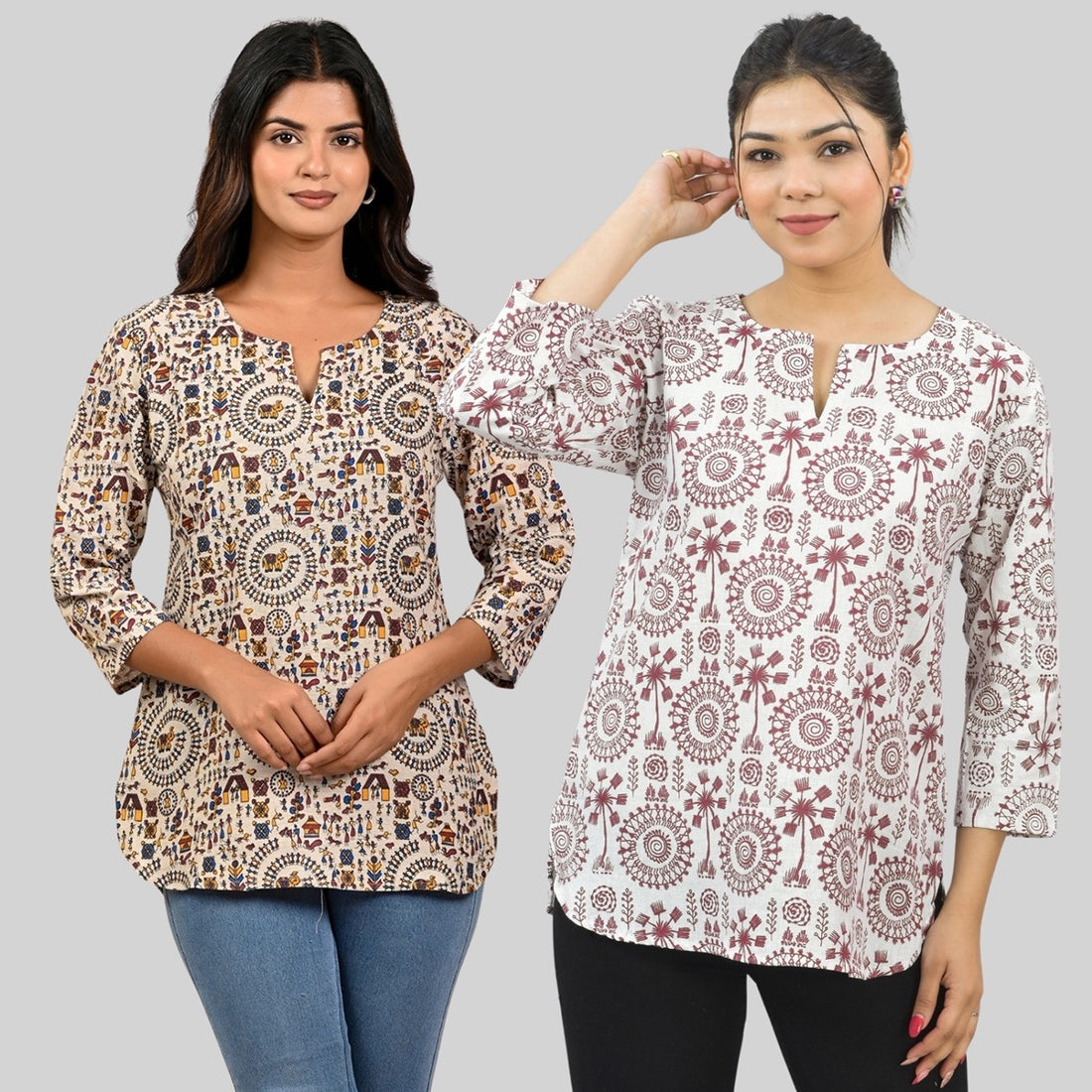 Pack Of 2 Womens Regular Fit Brown Multi Printed And Maroon Tribal Printed Tops Combo
