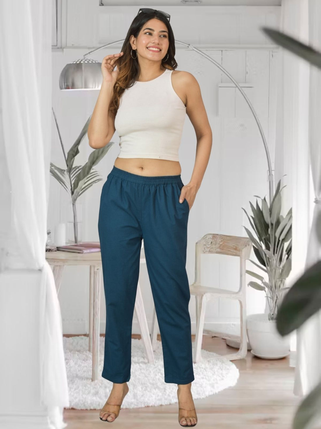 Teal Blue Fully Elastic Airy Linen Cotton Pants