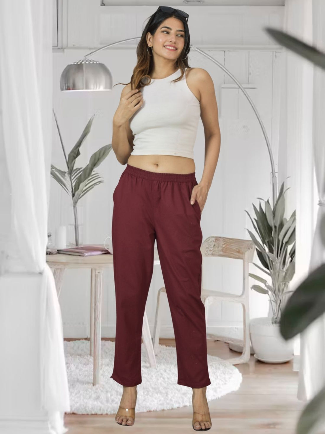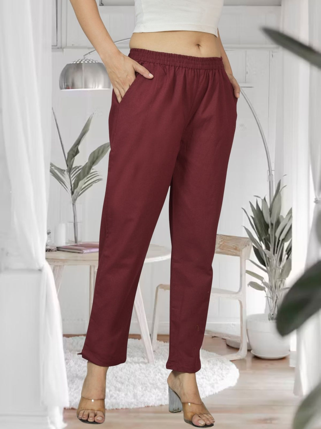 This Quaclo Wine Women Two Pocket Pure Cotton Trouser is a functional and fashionable addition...