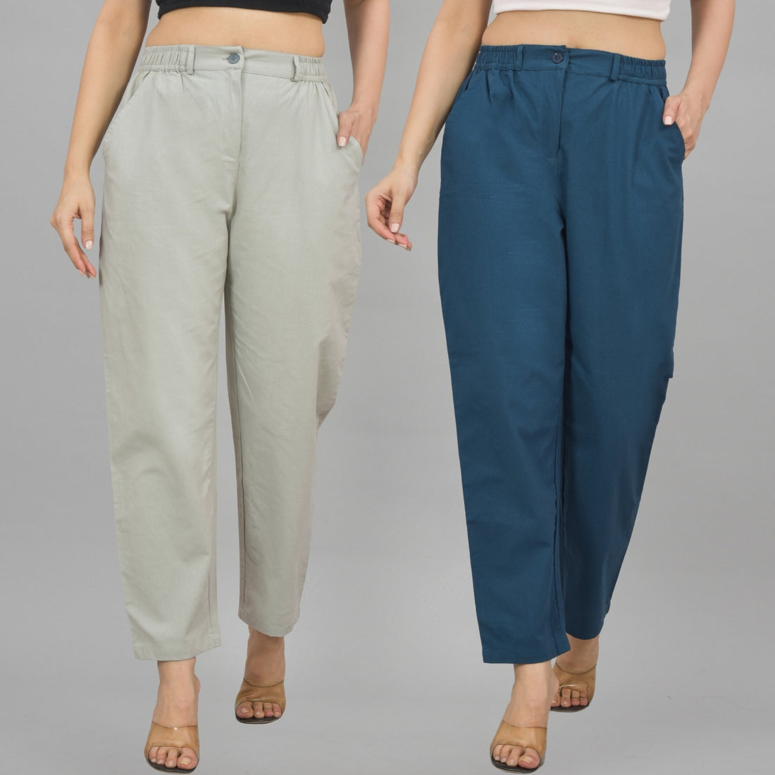 Combo Pack Of 2 Grey And Teal Blue Womens Cotton Formal Pants