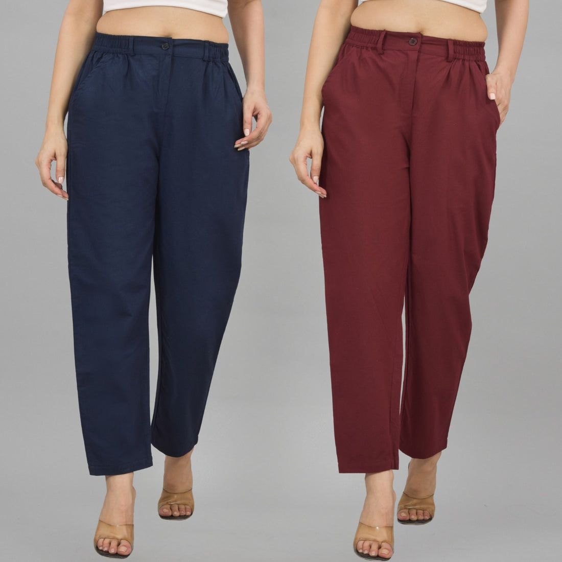 Combo Pack Of 2 Navy Blue And Wine Womens Cotton Formal Pants