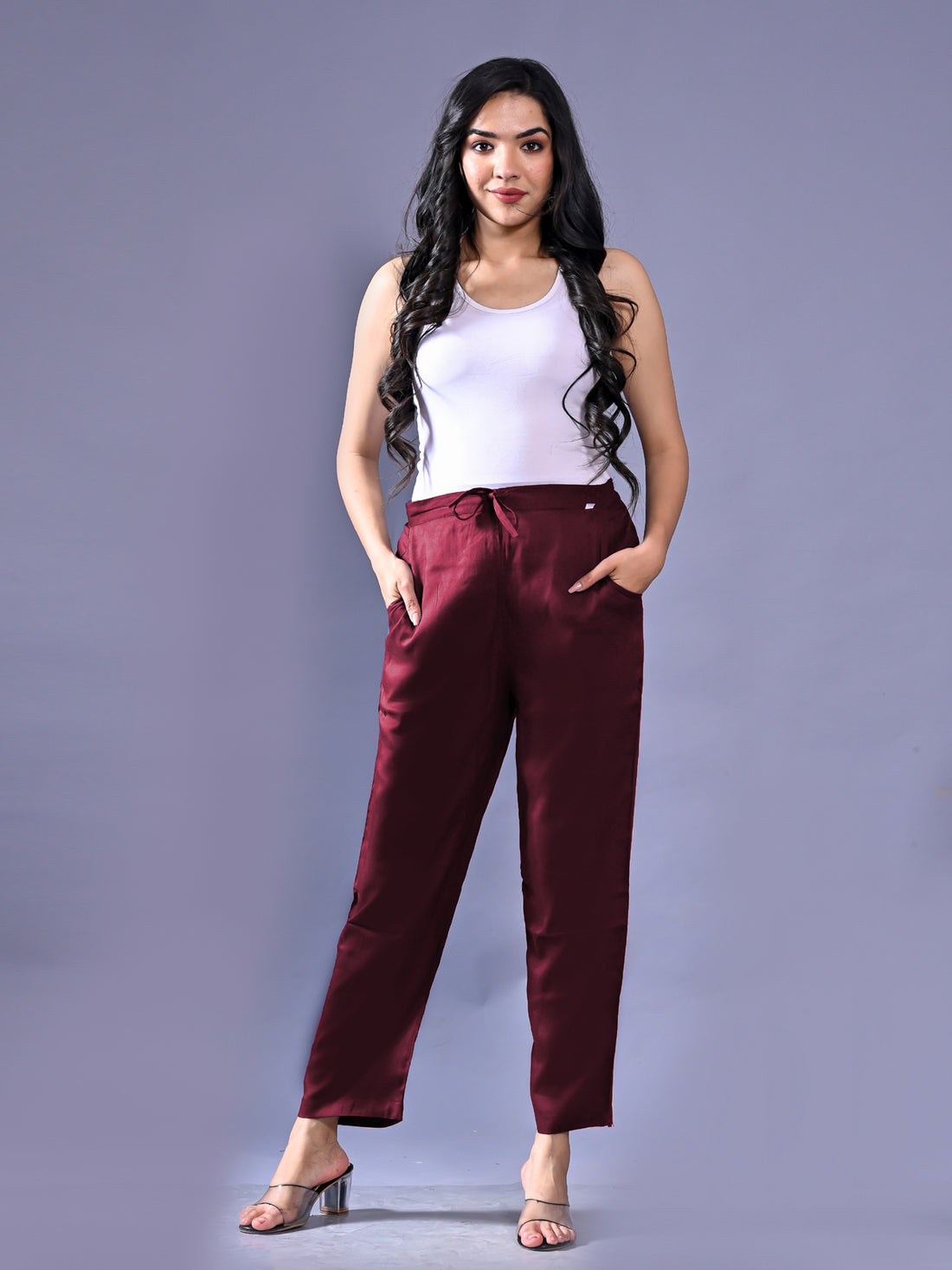 Women Regular Fit Wine Rayon Trouser