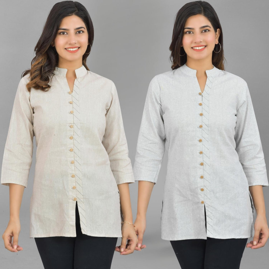 Pack Of 2 Womens Cream And Meange Grey Woven Design Handloom Cotton Frontslit Short Kurtis