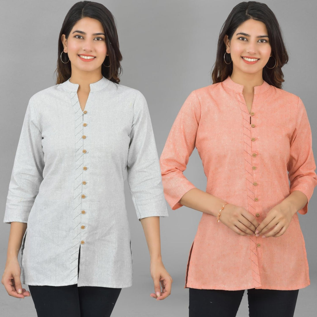 Pack Of 2 Womens Melange Grey And Orange Woven Design Handloom Cotton Frontslit Short Kurtis