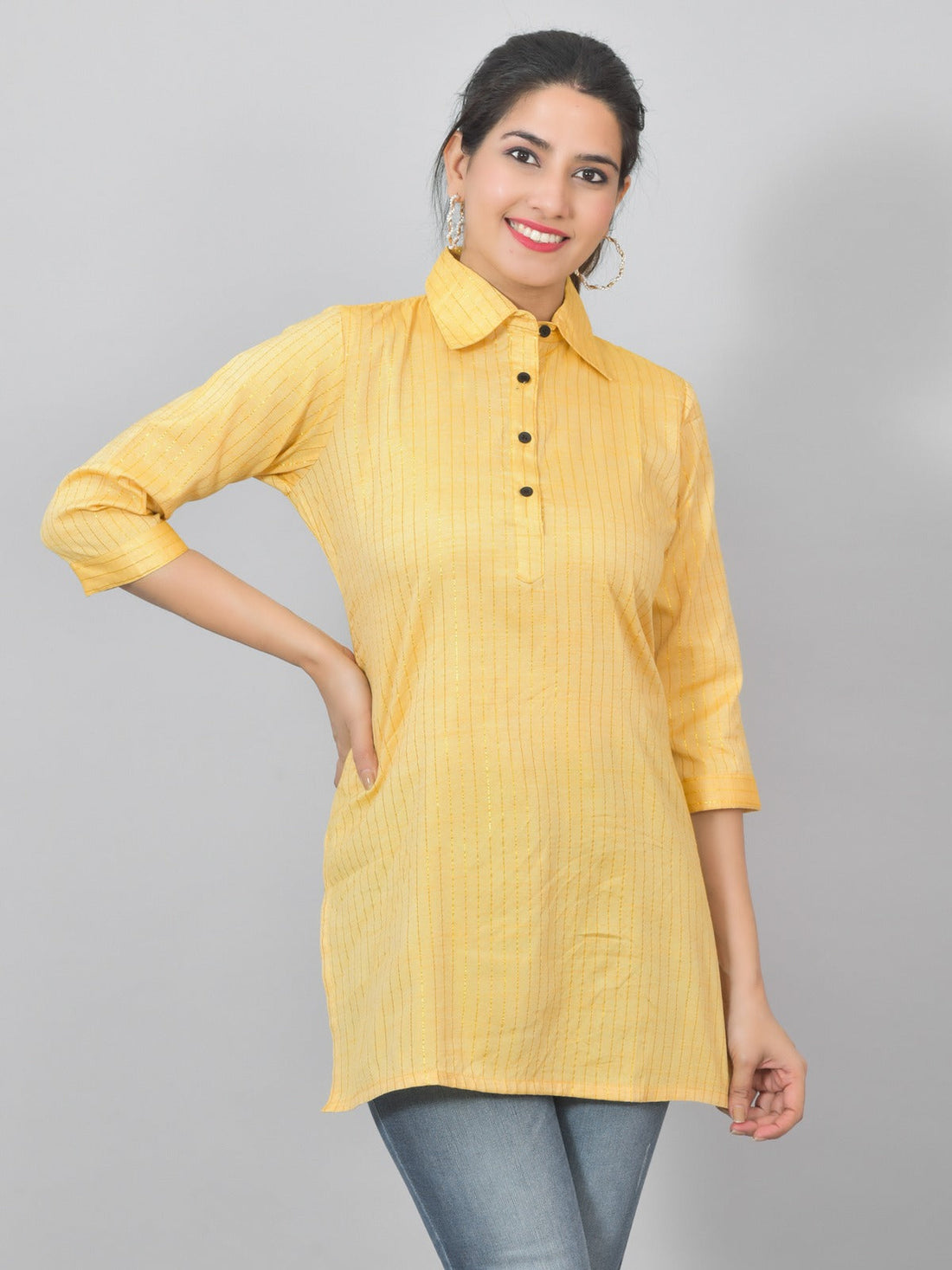 Womens Mustard Lurex Striped Spread Collar Short Kurti