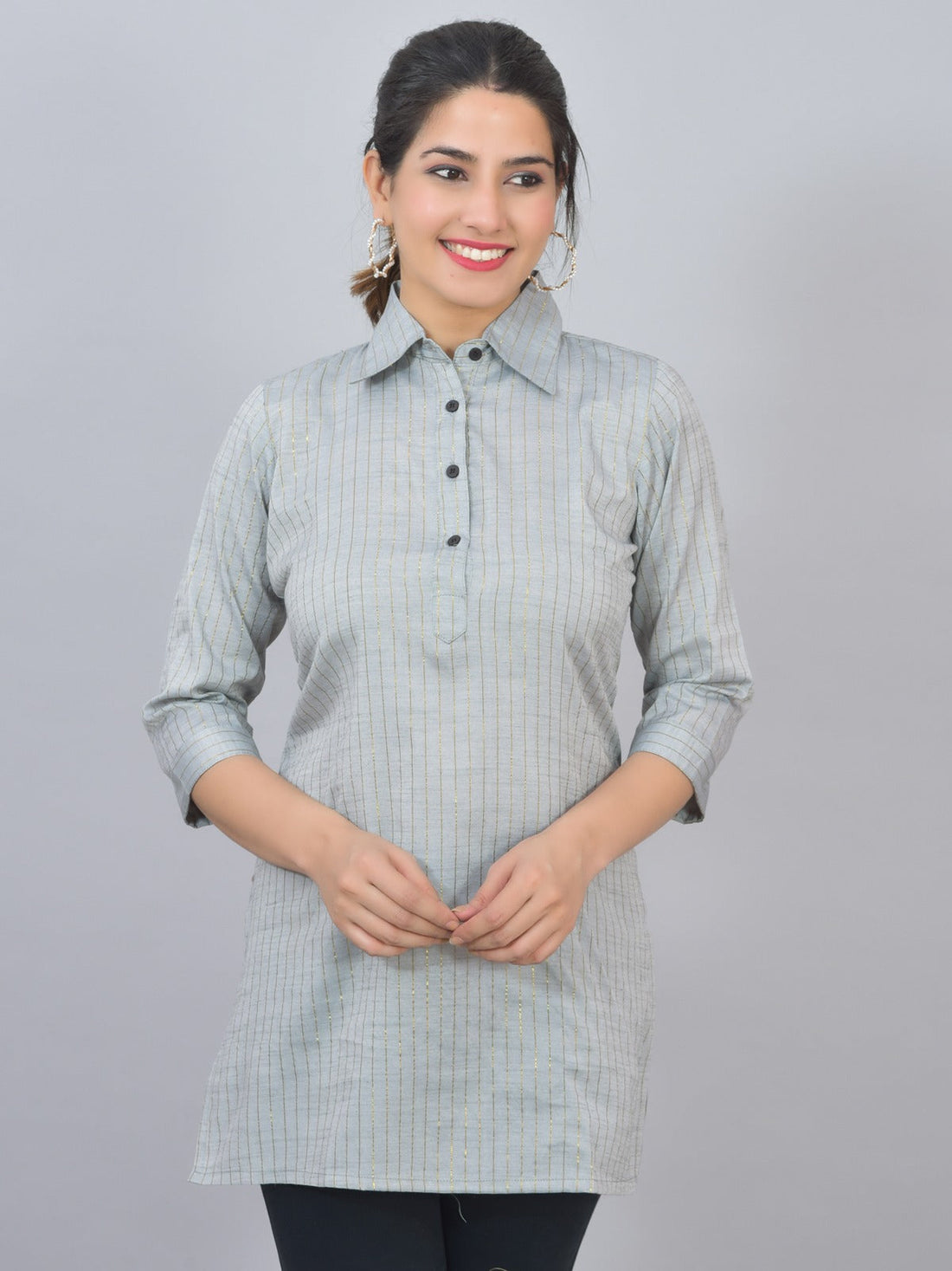 Womens Grey Lurex Striped Spread Collar Short Kurti