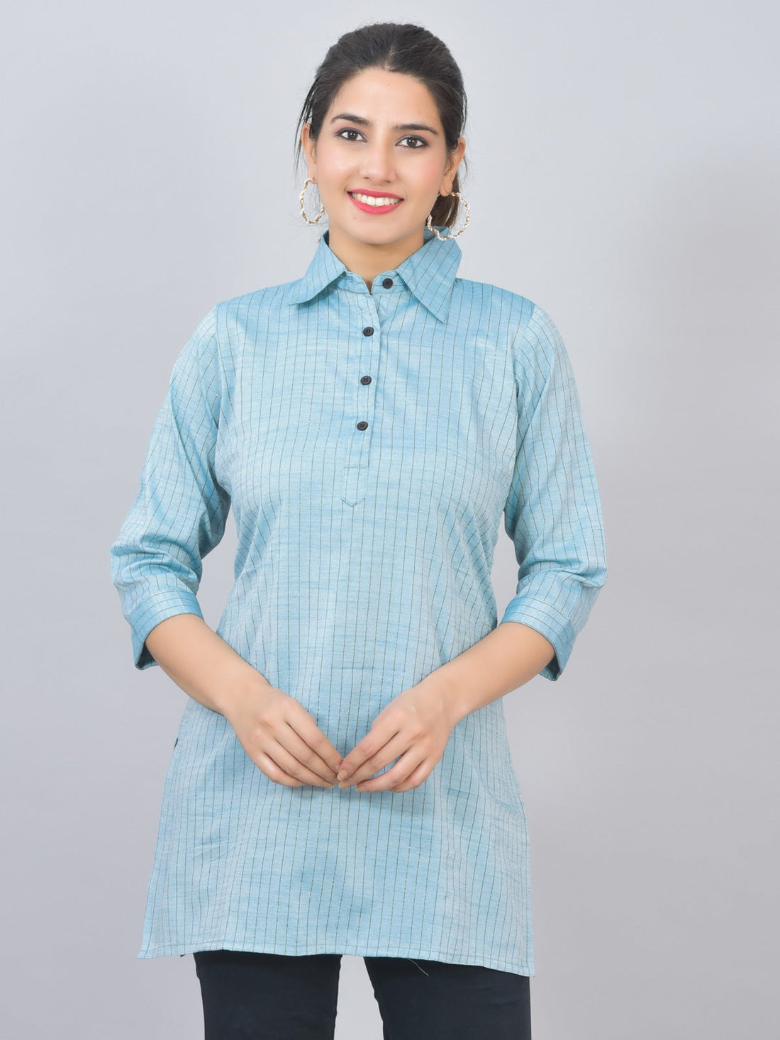 Womens Turquoise Lurex Striped Spread Collar Short Kurti