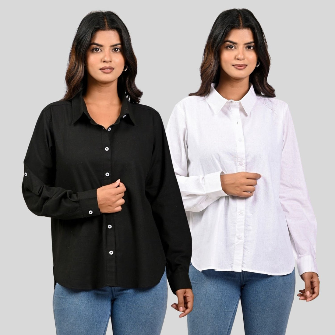 Women Black And White Solid Airy Linen Cotton Shirts Combo