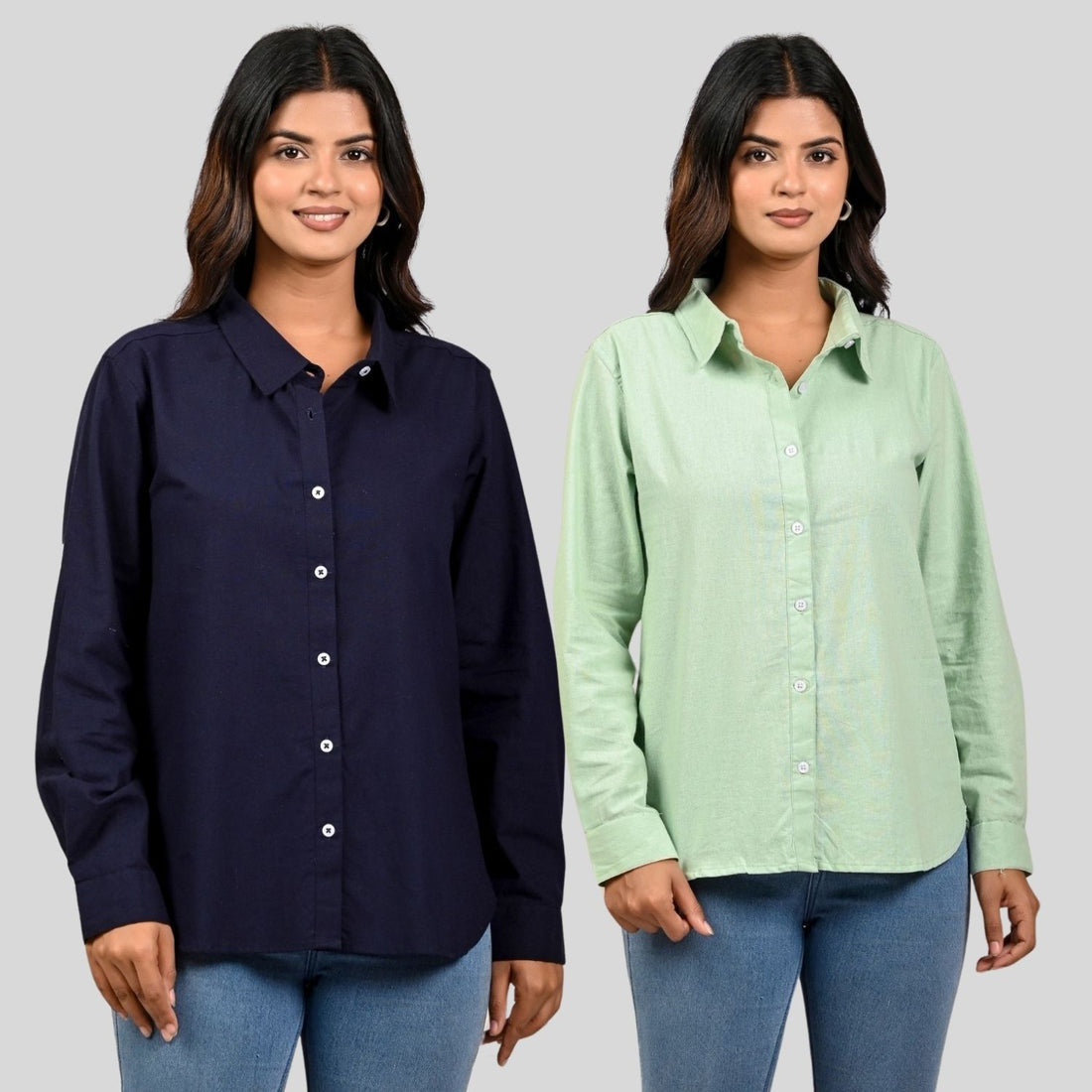 Women Navy Blue And Pista Green Solid Airy Linen Cotton Shirts Combo
