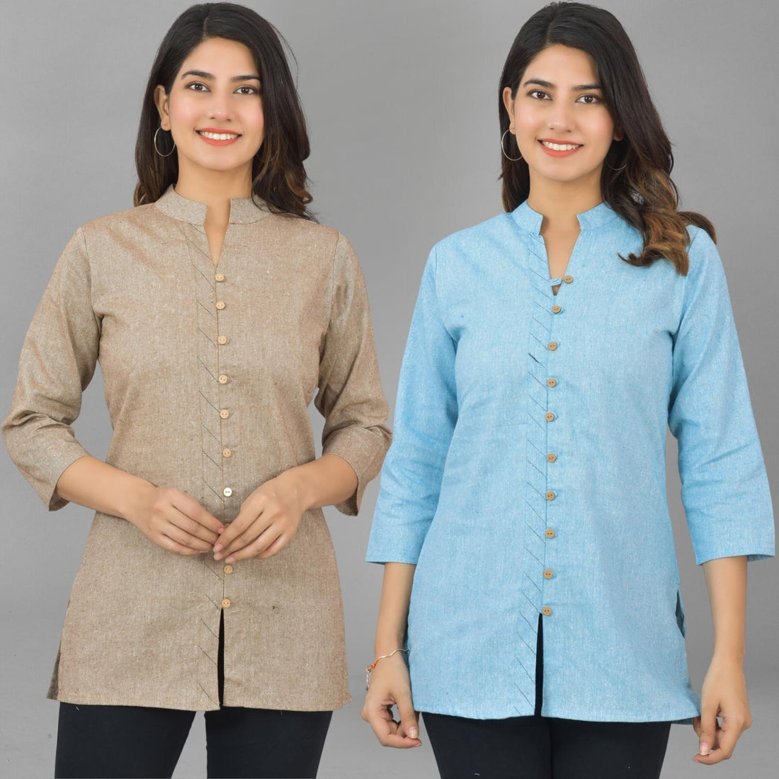 Pack Of 2 Womens Solid Sky Blue and White Rayon Chinese Collar Shirts Combo