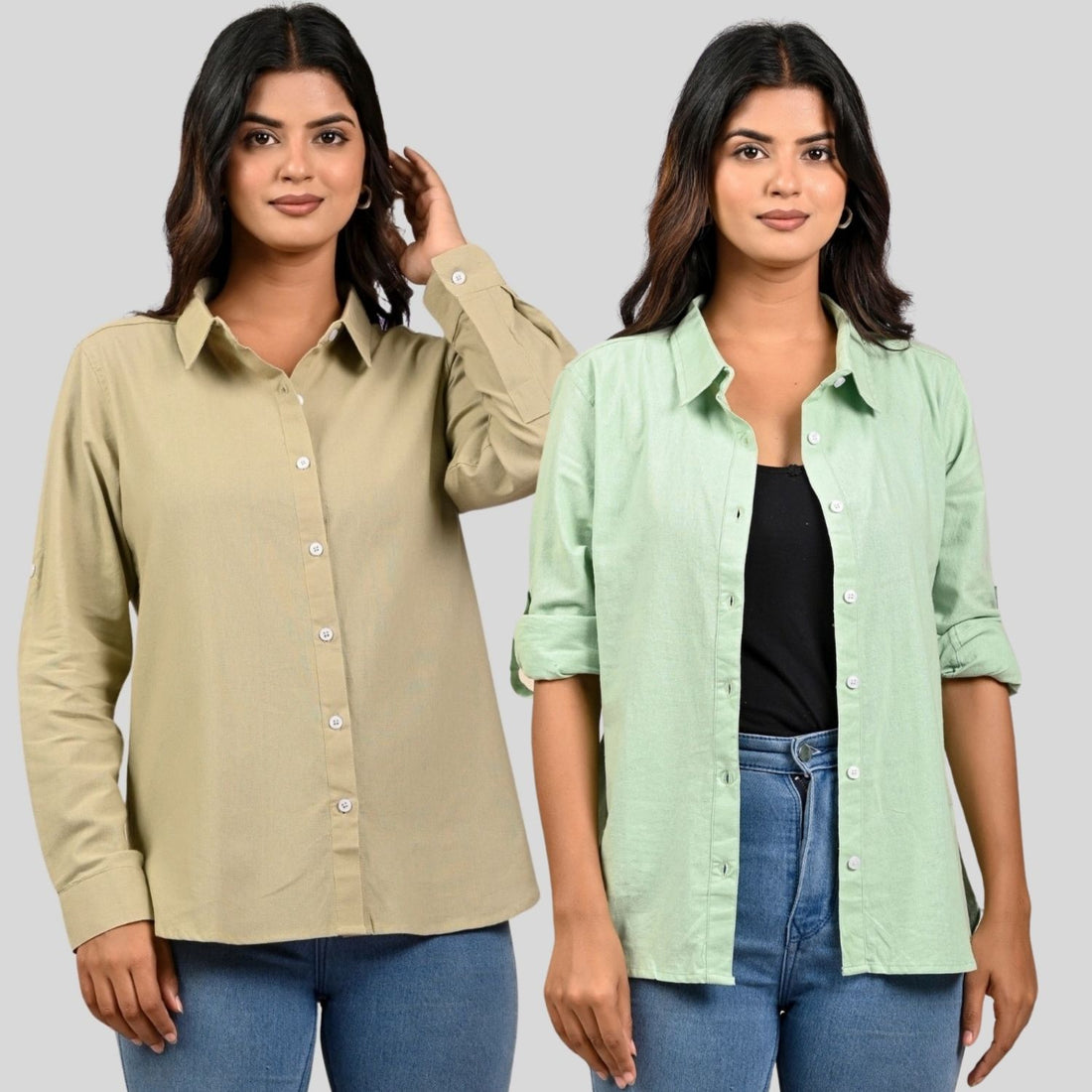 Women Beige And Pista Green Solid Airy Linen Cotton Shirts Combo