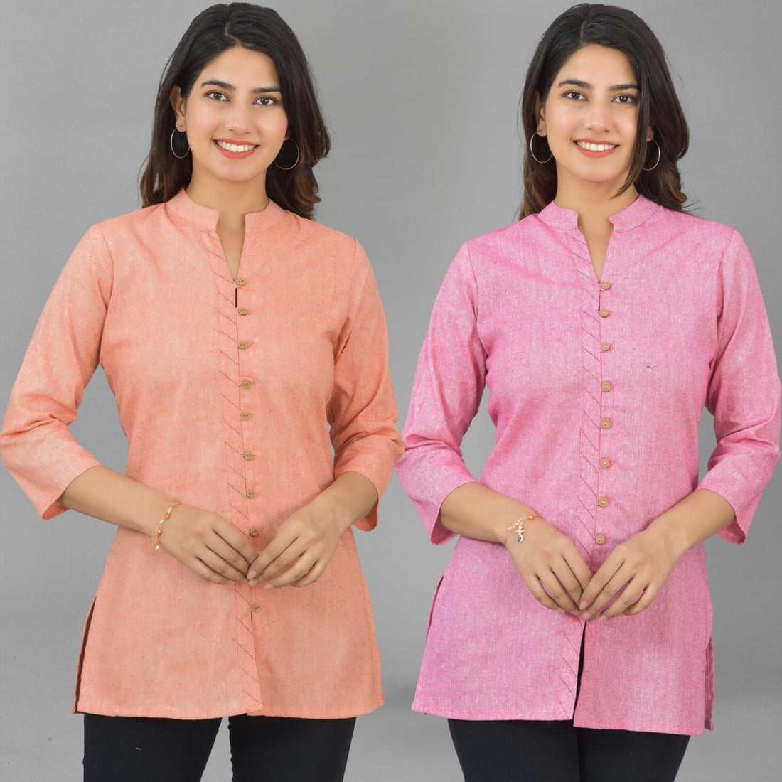 Pack Of 2 Womens Orange And Pink Woven Design Handloom Cotton Frontslit Short Kurtis