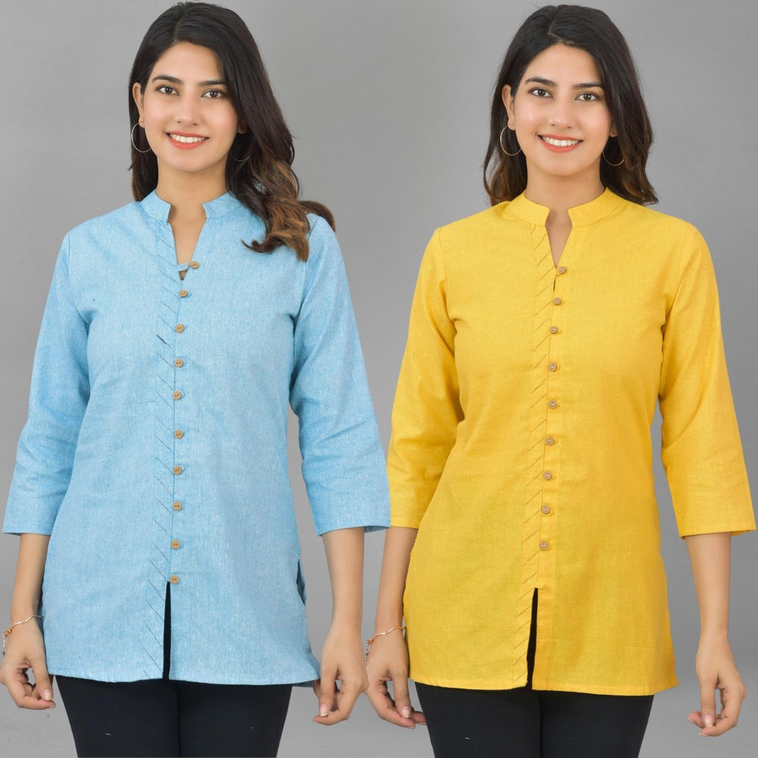 Pack Of 2 Womens Sky Blue And Yellow Woven Design Handloom Cotton Frontslit Short Kurtis