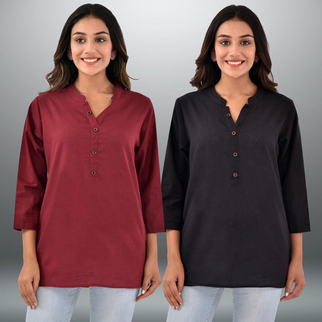 Pack Of 2 Womens Regular Fit Wine And Black Three Fourth Sleeve Cotton Tops Combo