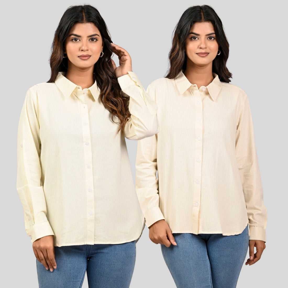 Women Cream And Off White Solid Airy Linen Cotton Shirts Combo