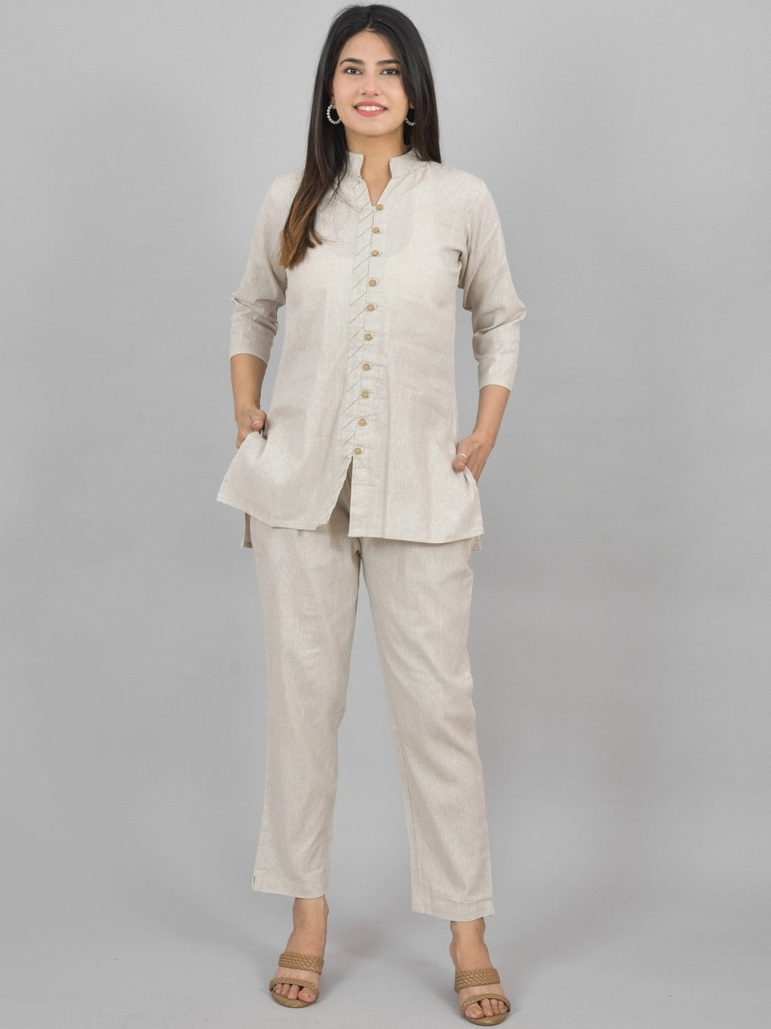 Womens Solid Beige Cotton Top-Pyjama Co-Ords Set
