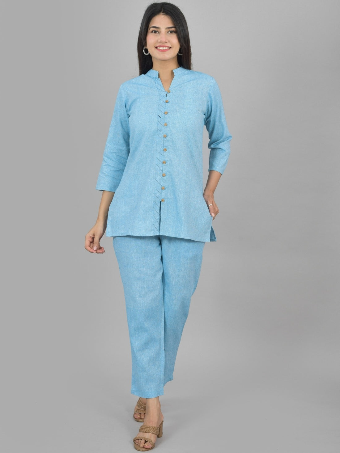 Womens Solid Sky Blue Cotton Top-Pyjama Co-Ords Set