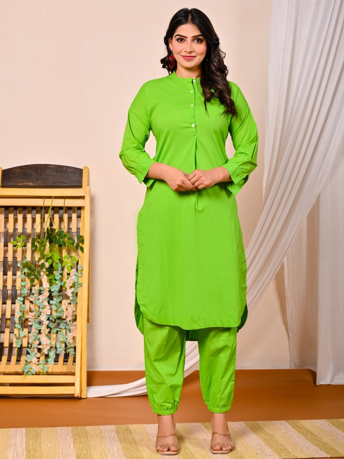 Womens Parrot Green Cotton Pathani Kurta and Pant Set