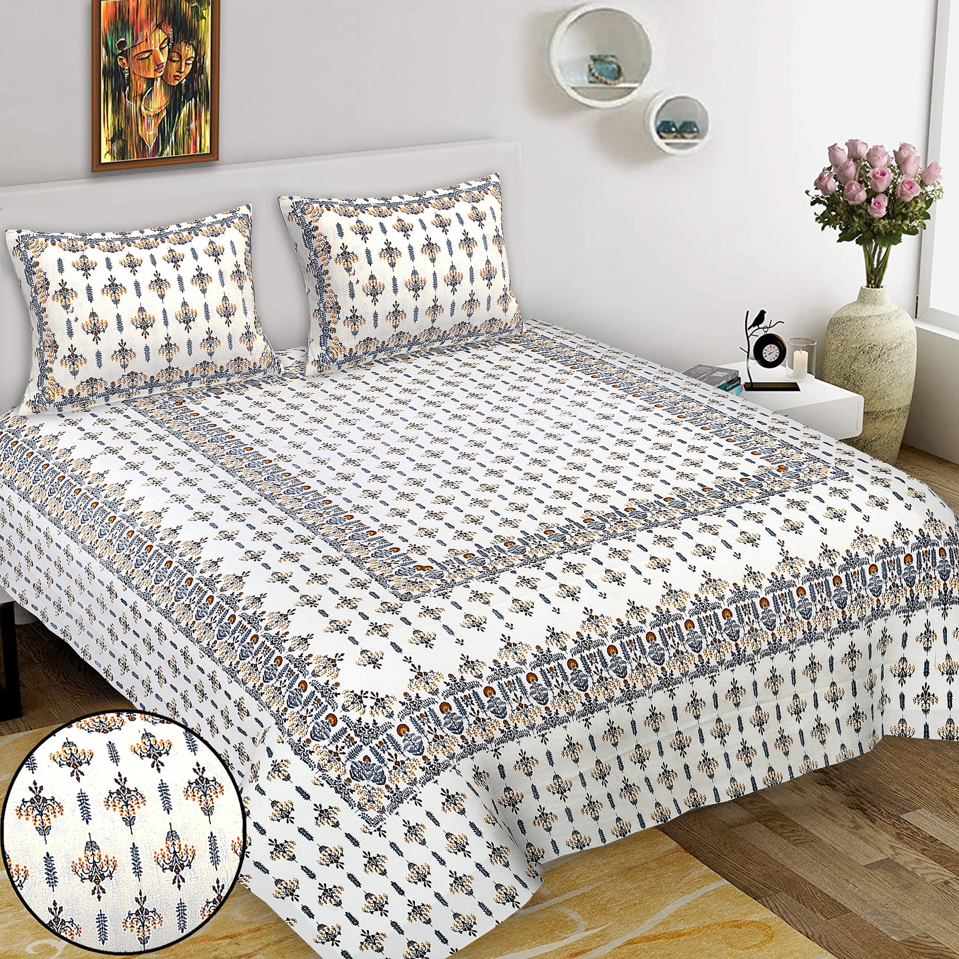 Bring home a touch of Rajasthan’s royal artistry with our Sanganeri Print Jaipur Bedsheet. Handcrafted by skilled artisans of Jaipur, this king-size bedsheet is made from 100% pure cotton, ensuring softness, breathability, and long-lasting durability.