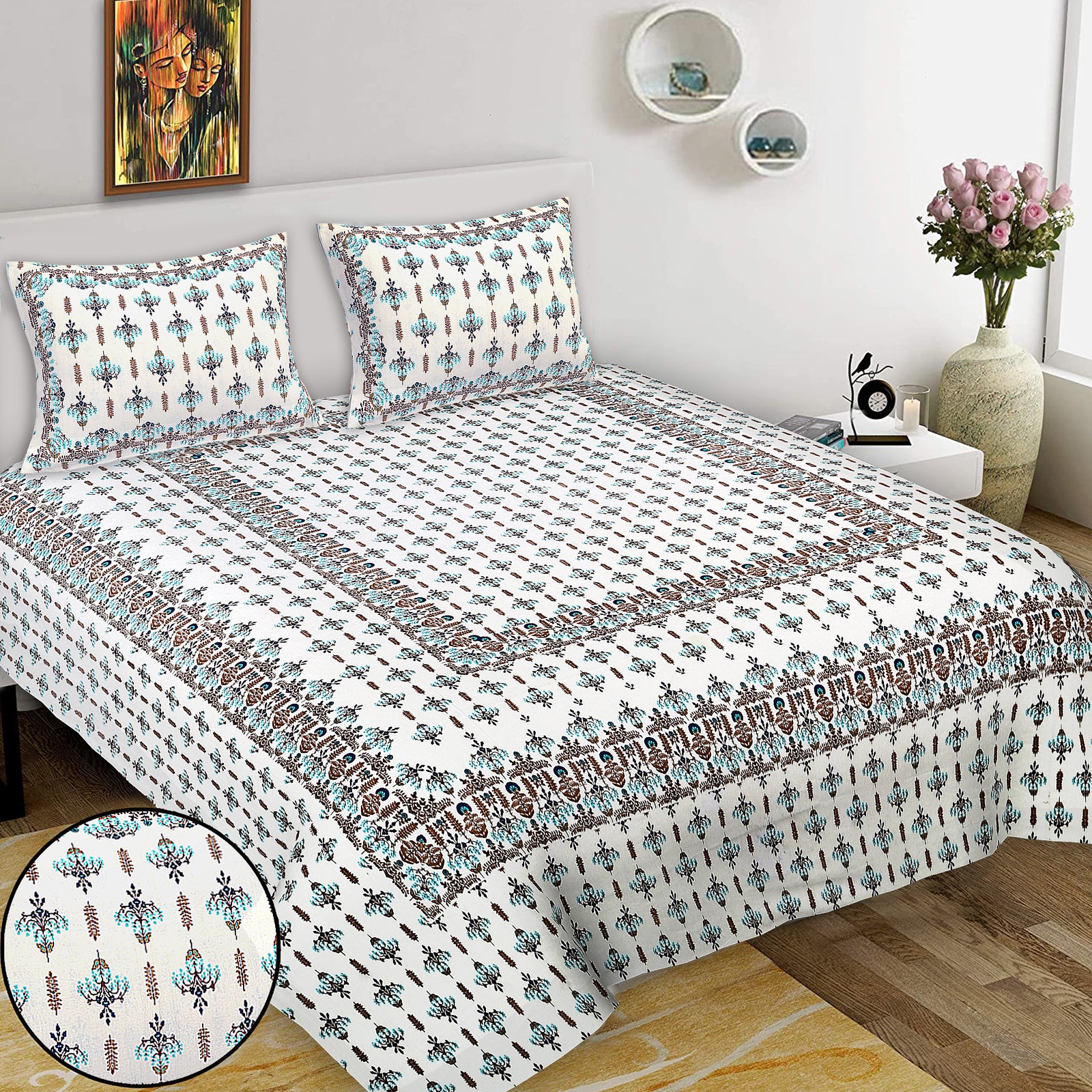 Jaipur Sanganer Print King Size Double Bedsheet,Light Blue,1003-4