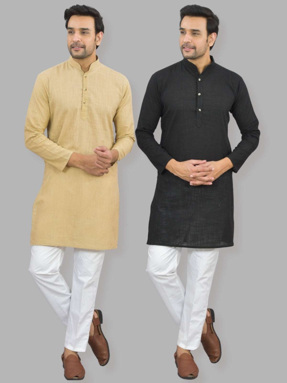 Mens Solid Beige And Black Cotton Long Kurta Combo