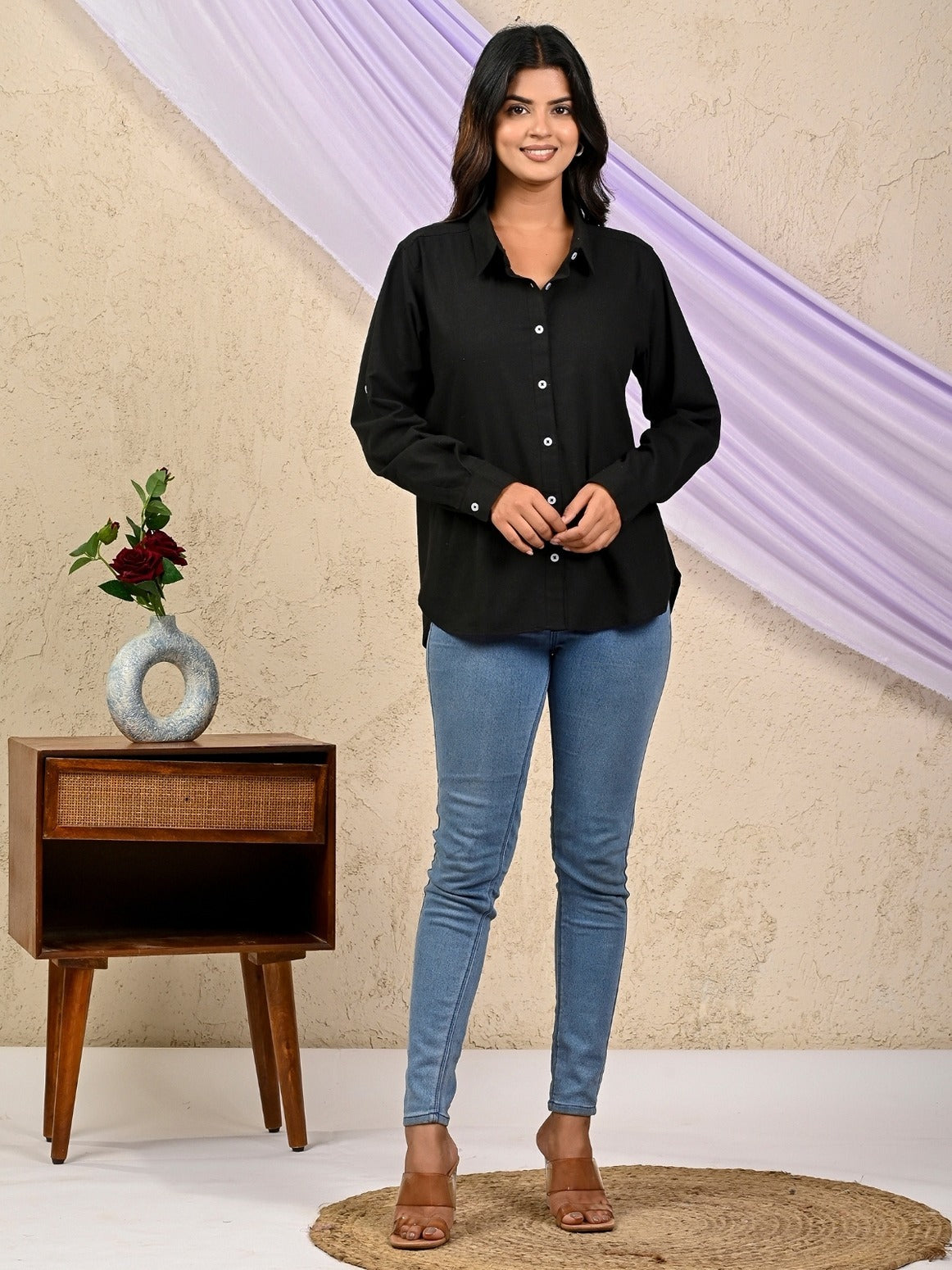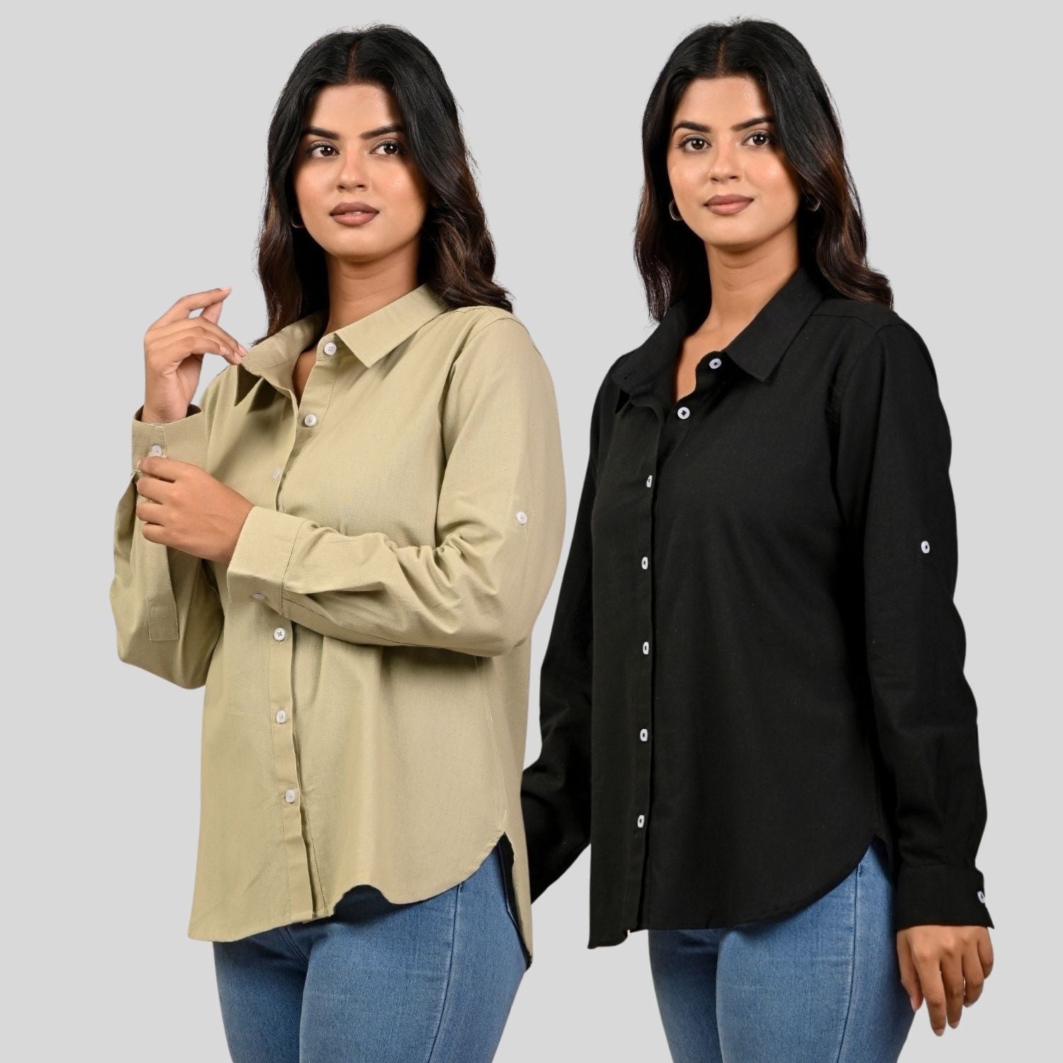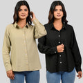 Women Beige And Black Solid Airy Linen Cotton Shirts Combo