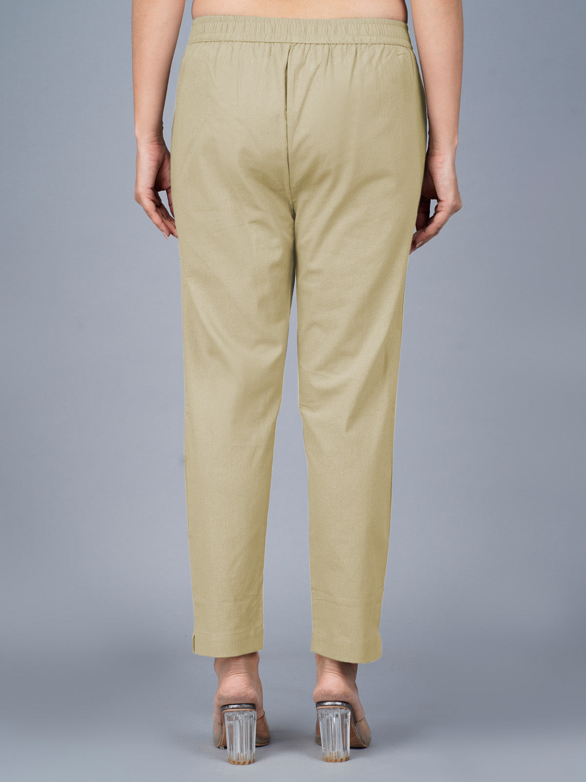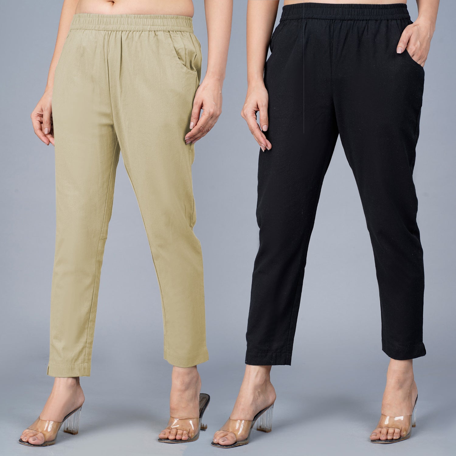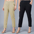 Pack Of 2 Womens Regular Fit Beige And Black Fully Elastic Waistband Cotton Trouser