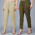 Pack Of 2 Womens Regular Fit Beige And Dark Green Fully Elastic Waistband Cotton Trouser