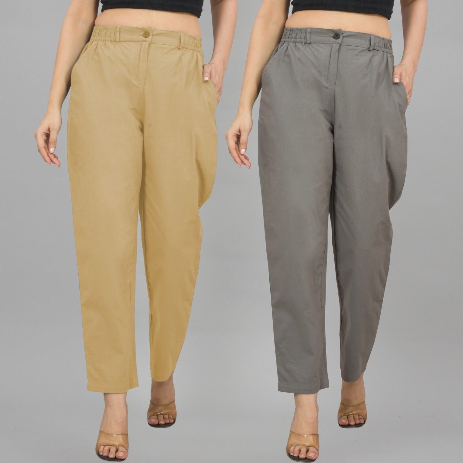 Combo Pack Of 2 Beige And Grey Womens Cotton Formal Pants