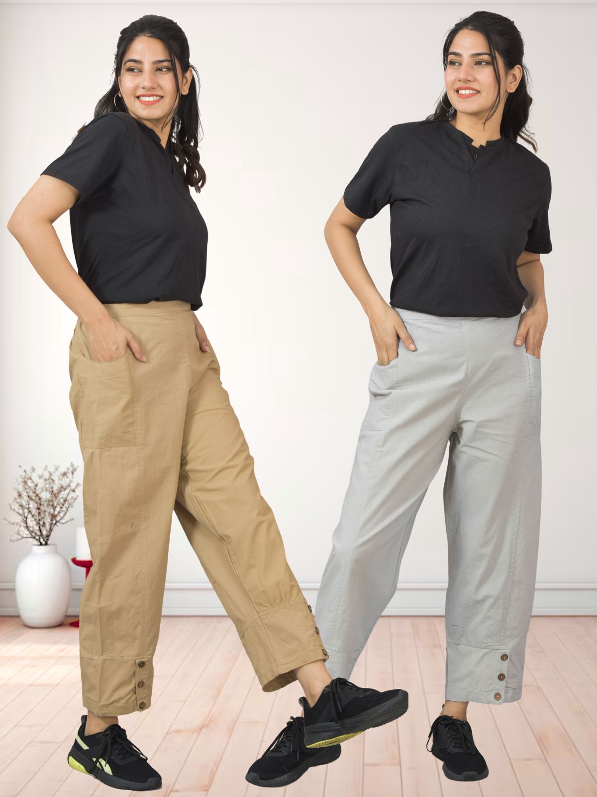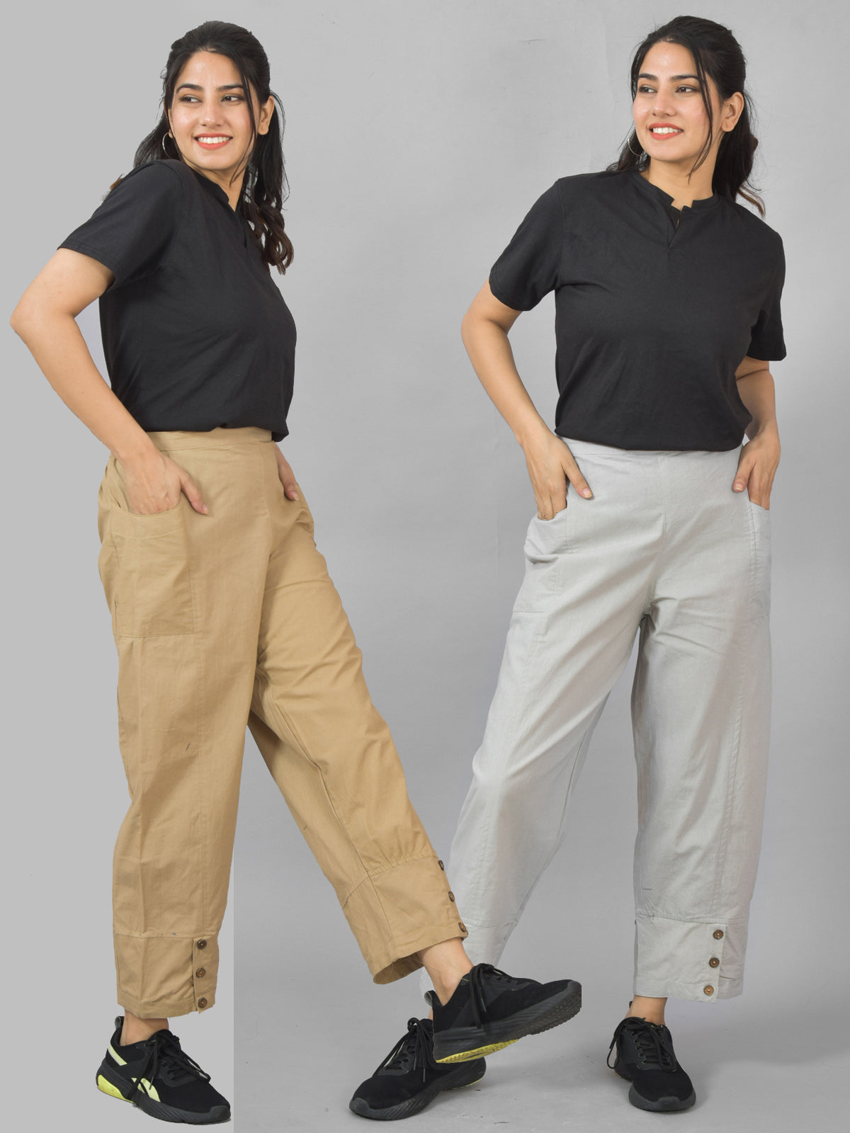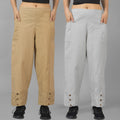 Combo Pack Of Womens Beige And Melange Grey Side Pocket Straight Cargo Pants