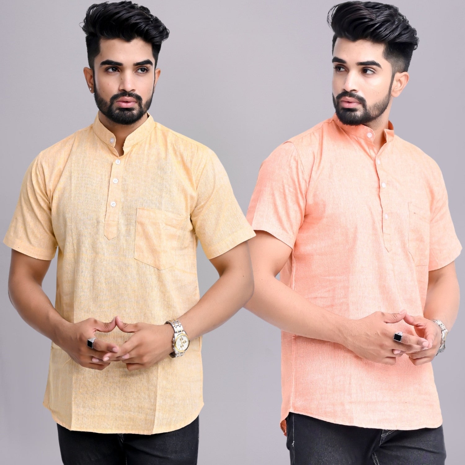 Pack of 2 Mens Solid Beige And Orange Khadi Cotton Short Kurta Combo
