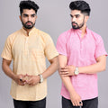 Pack of 2 Mens Solid Beige And Pink Khadi Cotton Short Kurta Combo