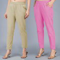 Pack Of 2 Womens Regular Fit Beige And Pink Fully Elastic Waistband Cotton Trouser
