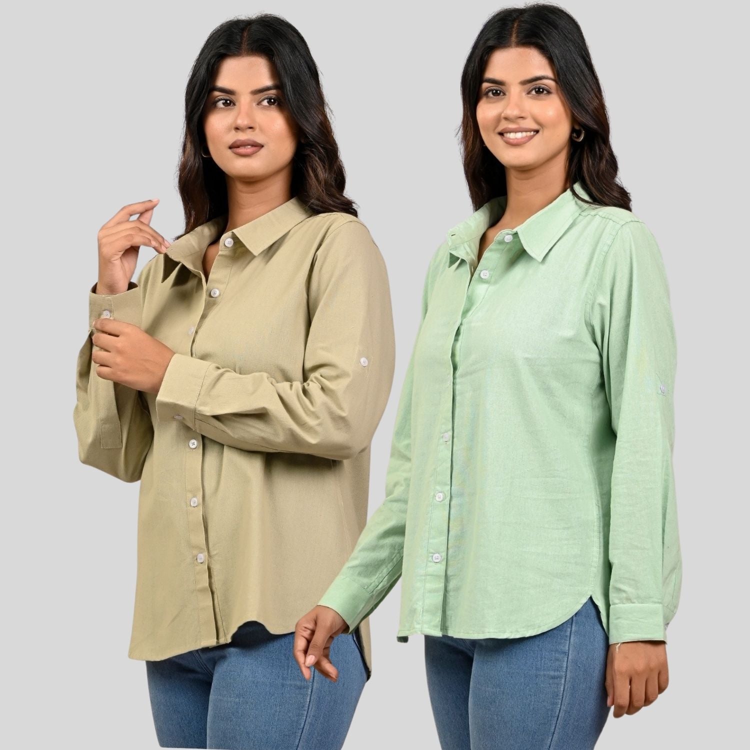 Women Beige And Pista Green Solid Airy Linen Cotton Shirts Combo