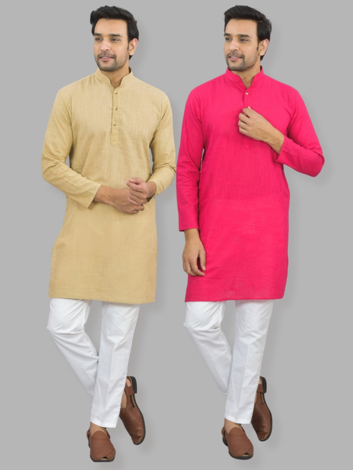 Mens Solid Beige And Rani Cotton Long Kurta Combo