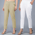 Pack Of 2 Womens Regular Fit Beige And White Fully Elastic Waistband Cotton Trouser
