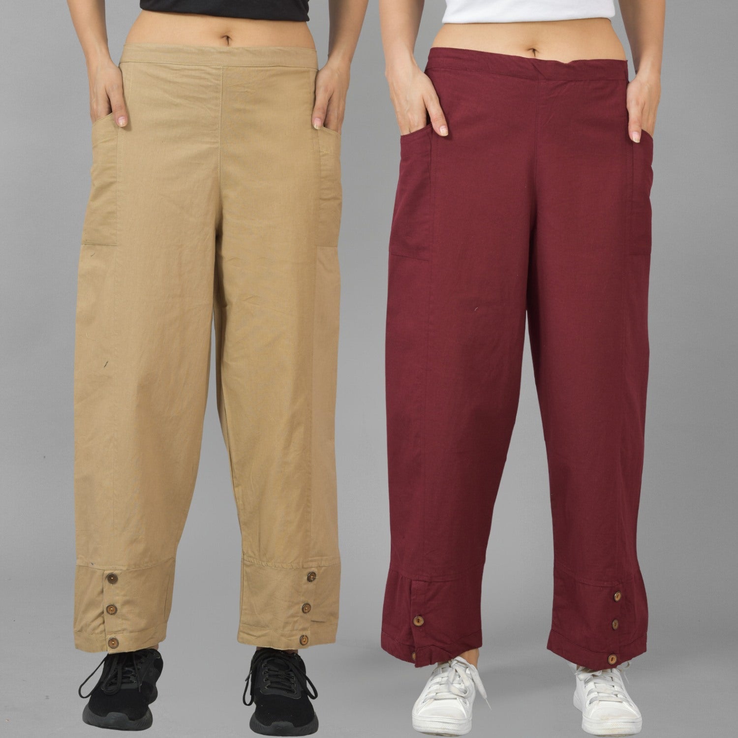 Combo Pack Of Womens Beige And Wine Side Pocket Straight Cargo Pants