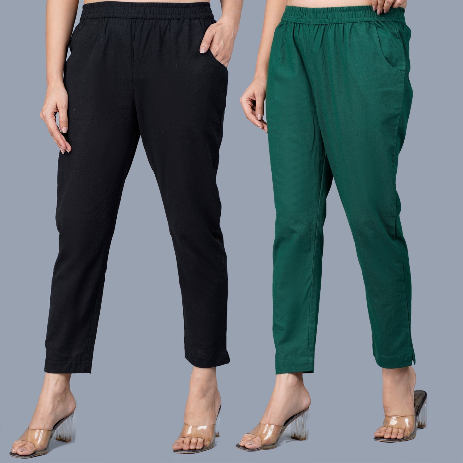 Pack Of 2 Womens Regular Fit Black And Bottle Green Fully Elastic Waistband Cotton Trouser