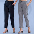Pack Of 2 Womens Regular Fit Black And Grey Cotton Slub Belt Pant Combo