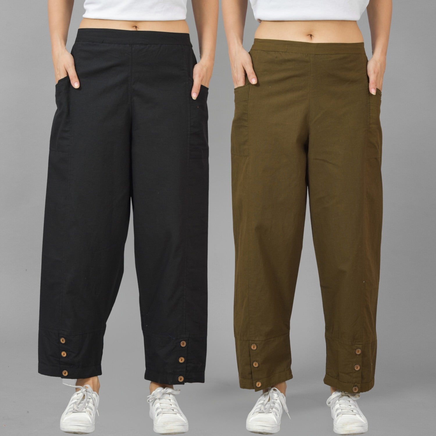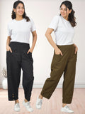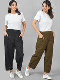 Combo Pack Of Womens Black And Mehndi Green Side Pocket Straight Cargo Pants