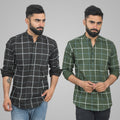 Pack Of 2 Mens Black And Mehendi Green Wide Check Cotton Short Kurta Combo