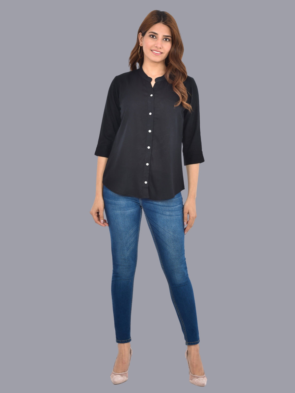 Pack Of 2 Womens Solid Black and Sky Blue Rayon Chinese Collar Shirts Combo