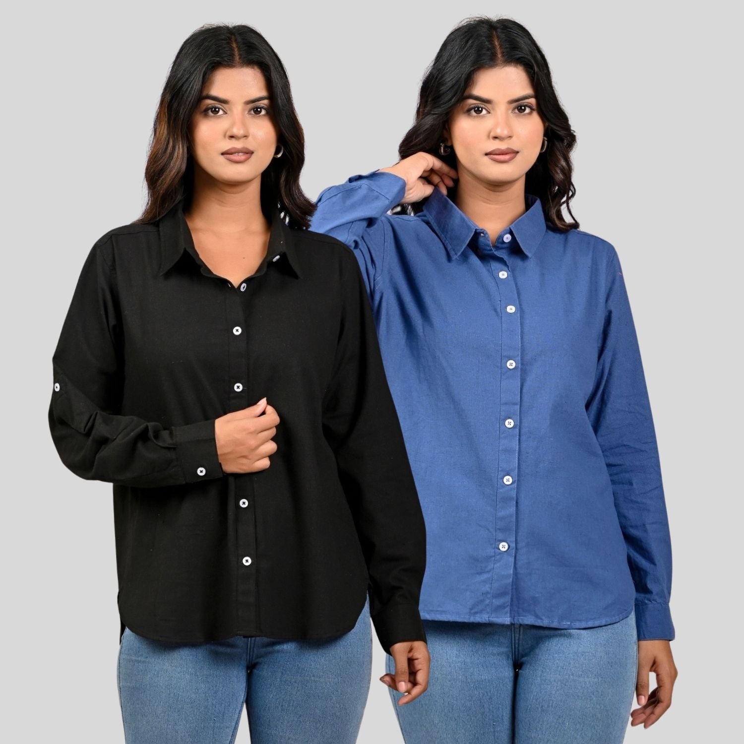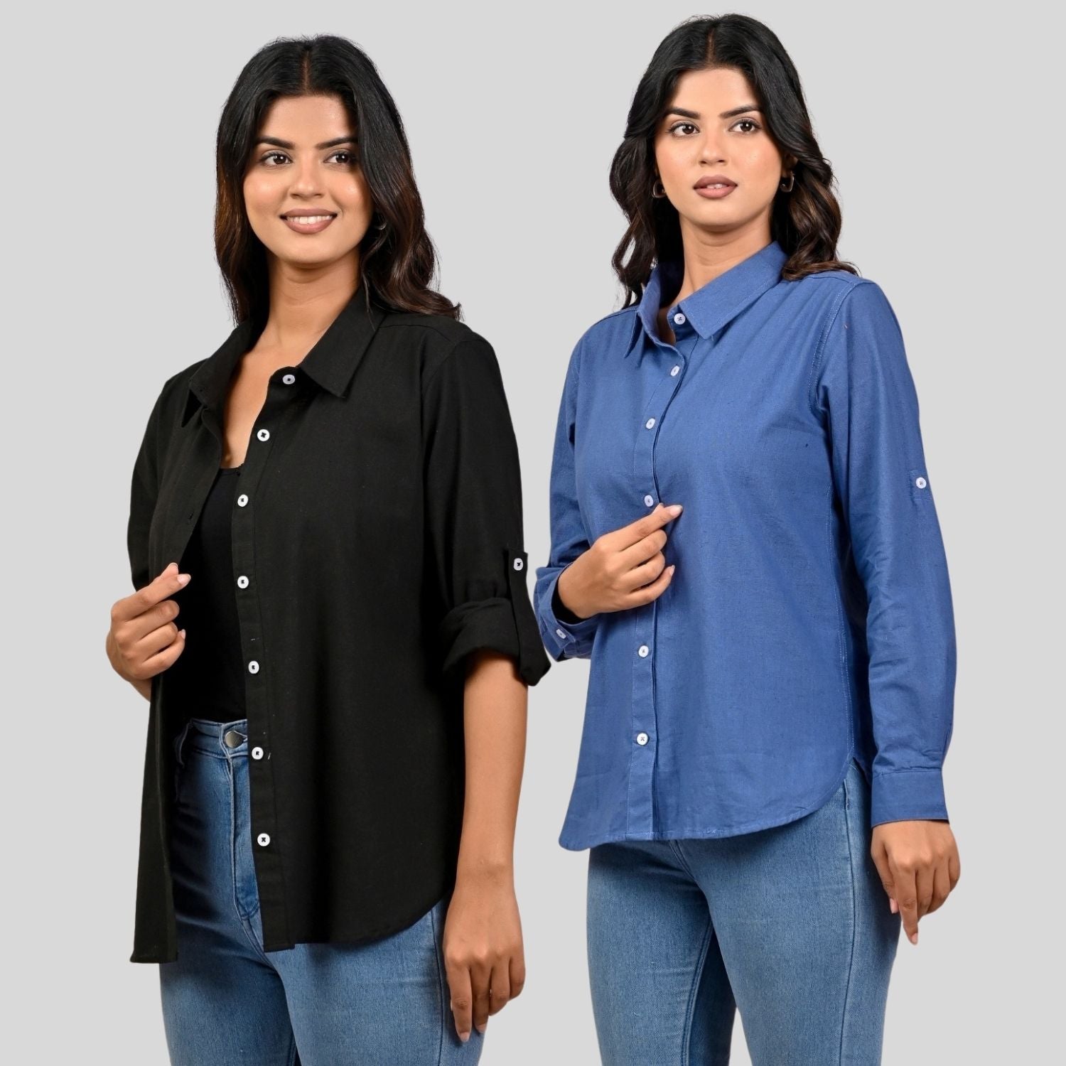 Women Black And Teal Blue Solid Airy Linen Cotton Shirts Combo