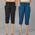 Pack Of 2 Womens Black And Teal Blue Calf Length Rayon Culottes Trouser Combo
